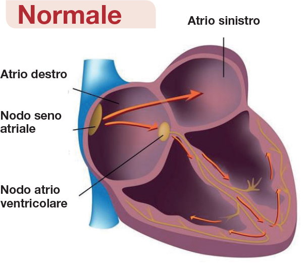 Per comprendere meglio ciò che caratterizza la FA sul piano fisiopatologico, si consideri che in condizioni normali una minuscola struttura situata nell’atrio destro, il nodo seno-atriale, svolge le funzioni di pacemaker naturale e genera impulsi regolari e ritmici. Questi, diffondendosi a tutto il muscolo cardiaco grazie a vie di conduzione a ciò predisposte, determinano la regolare contrazione (sistole) di atri e ventricoli consentendo così al sangue di essere immesso in modo efficace a livello polmonare e nella circolazione sistemica. In queste condizioni si dice che il ritmo cardiaco è “sinusale”. Nella FA, invece, gli impulsi elettrici non vengono più generati nel solo nodo seno-atriale ma in molti punti differenti, in maniera totalmente caotica e con frequenza estremamente elevata, dando così origine a movimenti irregolari, disorganizzati, frammentari e quindi inefficaci. Tra le conseguenze di questo anomalo funzionamento muscolare, oltre ad una deficitaria azione di propulsione del sangue che aumenta la possibilità di scompenso cardiaco e riduzione globale della qualità di vita, vi è la formazione di trombi all’interno dell’atrio con conseguente possibilità di embolizzazione e quindi di Ictus ischemico.
